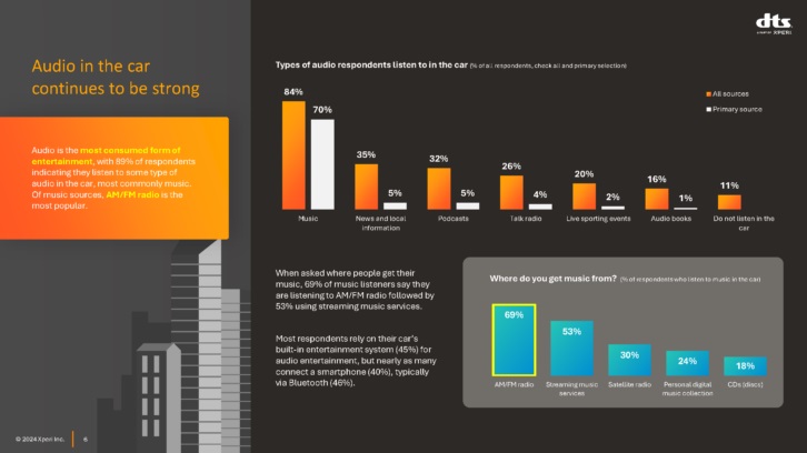 قال ما يقرب من 90% من المشاركين في الاستطلاع إن الصوت هو أكثر أشكال الترفيه استخدامًا في سياراتهم. كانت الموسيقى هي الأكثر استهلاكًا للترفيه الصوتي بالنسبة لـ 84% من المشاركين، وقال 69% منهم إن راديو AM/FM هو مصدر الموسيقى المفضل لديهم، يليه 53% الذين قالوا البث المباشر و30% قالوا الراديو عبر الأقمار الصناعية.