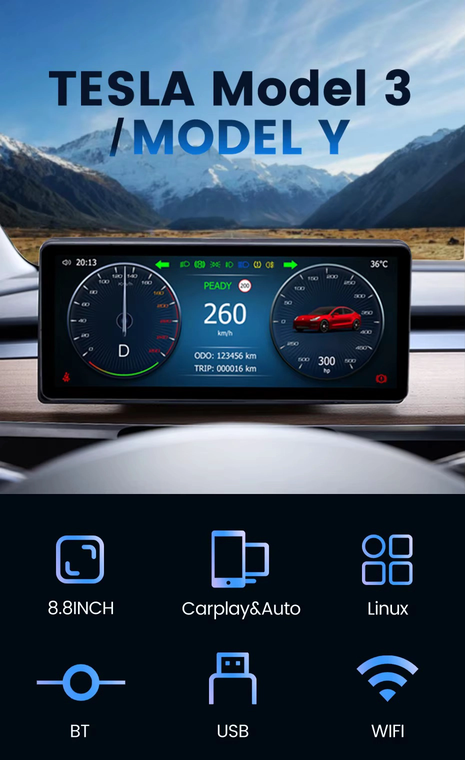 IPS Display Mileage Speed für Tesla Model 3/Y Informationen Smart Digital Speed Linux für Tesla