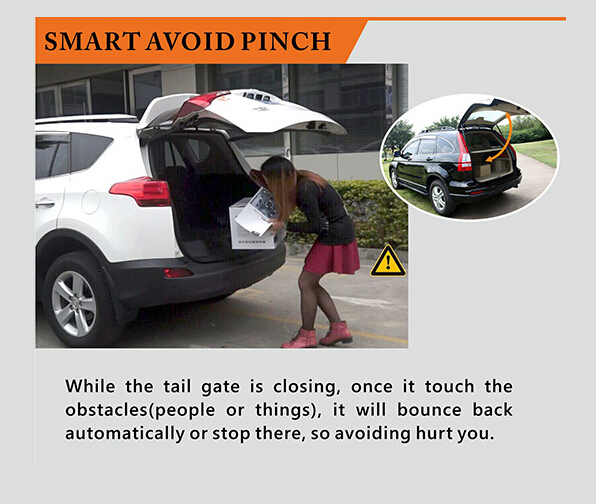 While the tail gate is closing, once it touch the obstacles(people or things), it will bounce back automatically or stop there, so avoiding hurt you.