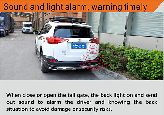 When close or open the tail gate, the back light on and send out sound to alarm the driver and knowing the back situation to avoid damage or security risks.