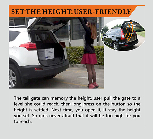 The tail gate can memory the height, user pull the gate to a level she could reach, then long press on the button so the height is settled. Next time, you open it, it stay the height you set. So girls never afraid that it will be too high for you to reach.
